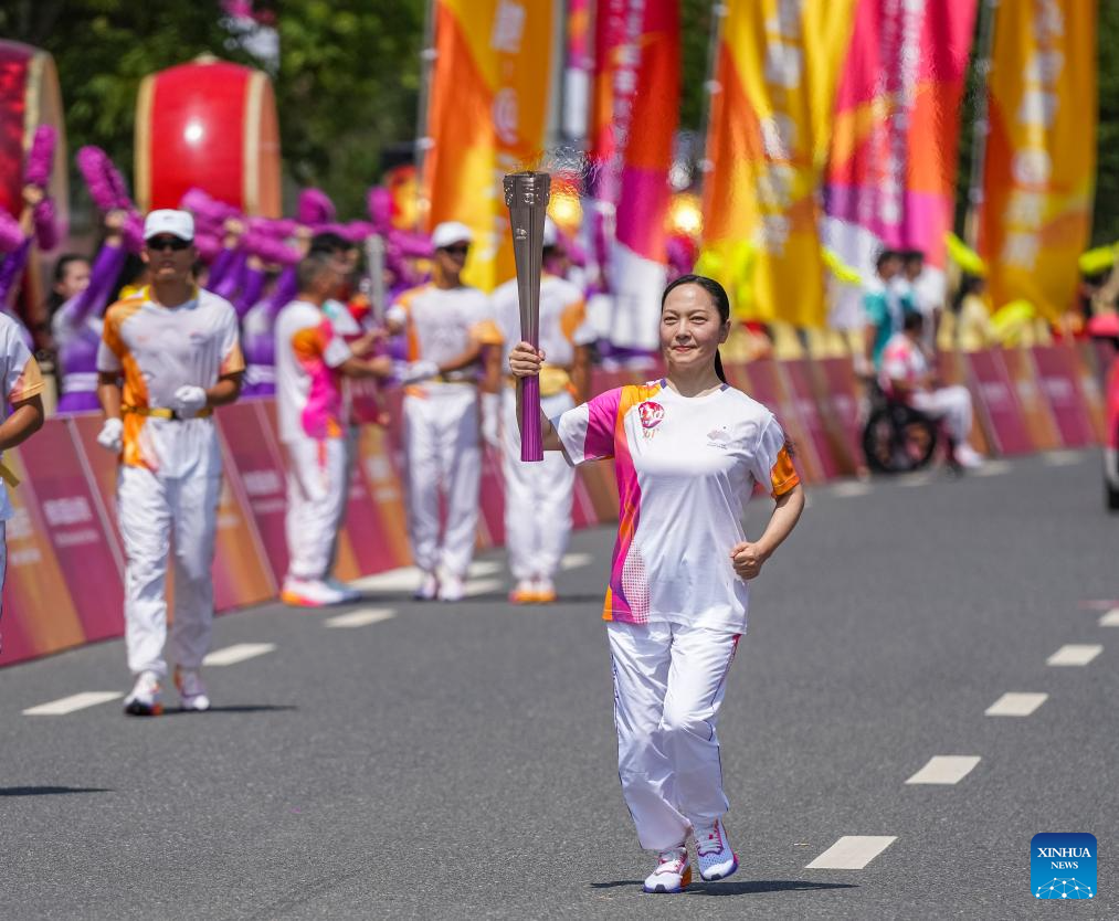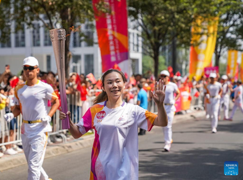 Torch bearer Cheng Ying runs with the torch during the torch relay of the 19th Asian Games in Jinhua, east China's Zhejiang Province, Sept. 17, 2023. (Xinhua/Sun Fei)