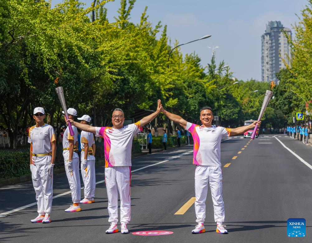 Torch bearers Gu Hailong (R) and Jin Ze during the torch relay of the 19th Asian Games in Jinhua, east China's Zhejiang Province, Sept. 17, 2023. (Xinhua/Sun Fei)