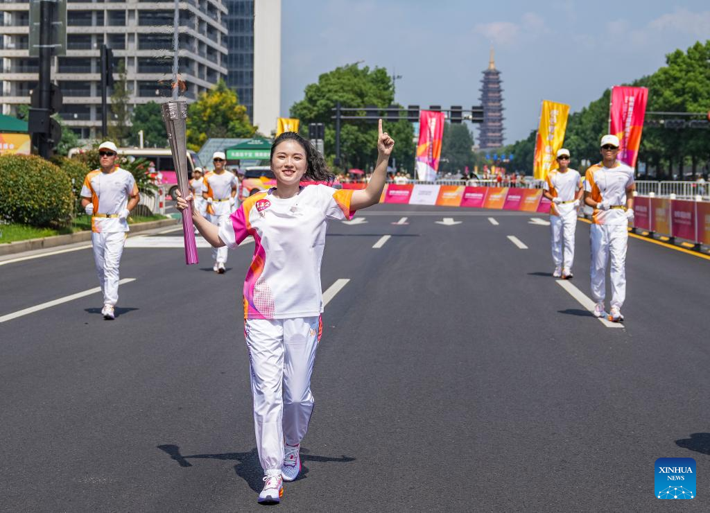 Torch bearer Xu Chenlu runs with the torch during the torch relay of the 19th Asian Games in Jinhua, east China's Zhejiang Province, Sept. 17, 2023. (Xinhua/Sun Fei)