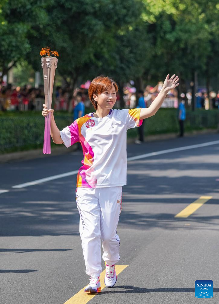 Torch bearer CHen Meilan runs with the torch during the torch relay of the 19th Asian Games in Jinhua, east China's Zhejiang Province, Sept. 17, 2023. (Xinhua/Sun Fei)