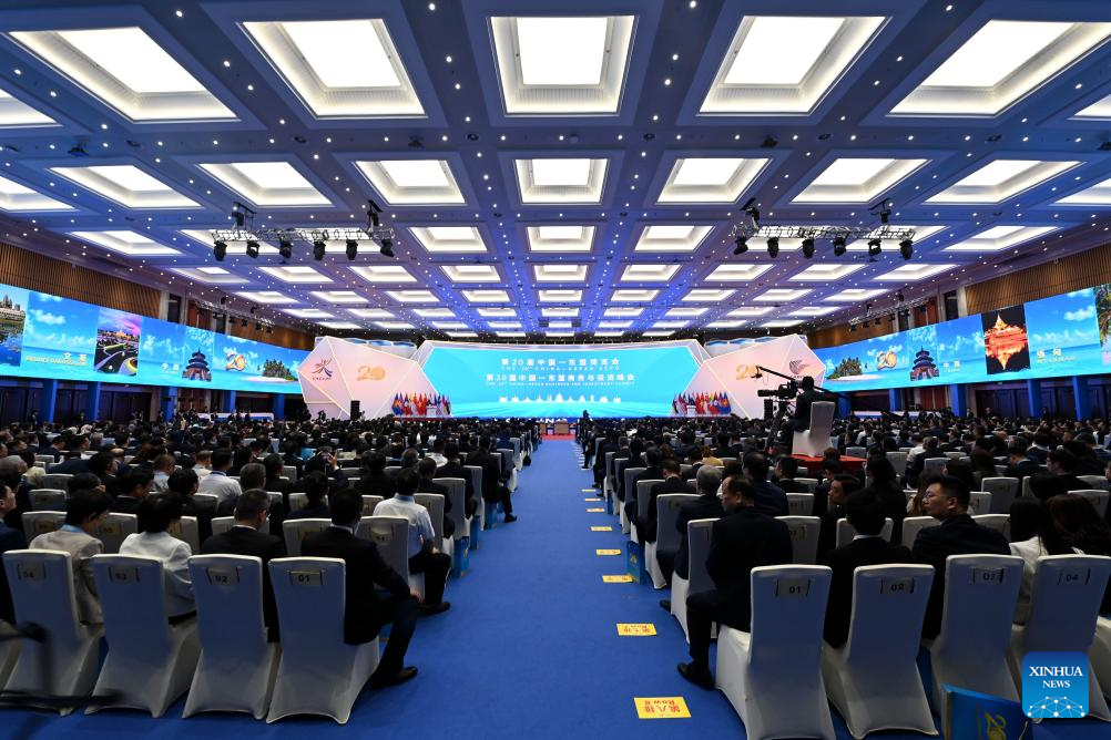 This photo taken on Sept. 17, 2023 shows the opening ceremony of the 20th China-ASEAN Expo and China-ASEAN Business and Investment Summit held in Nanning International Conference and Exhibition Center in Nanning, capital of south China's Guangxi Zhuang Autonomous Region. The opening ceremony of the 20th China-ASEAN Expo and China-ASEAN Business and Investment Summit was held on Sunday in Nanning. (Xinhua/Cao Yiming)