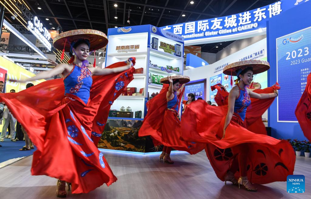 Actresses perform dance near a booth of Vietnam at Belt and Road International Pavilion during the 20th China-ASEAN Expo at Nanning International Convention and Exhibition Center in Nanning, capital of south China's Guangxi Zhuang Autonomous Region, Sept. 17, 2023. The opening ceremony of the 20th China-ASEAN Expo and China-ASEAN Business and Investment Summit was held on Sunday in Nanning. (Xinhua/Zhang Ailin)