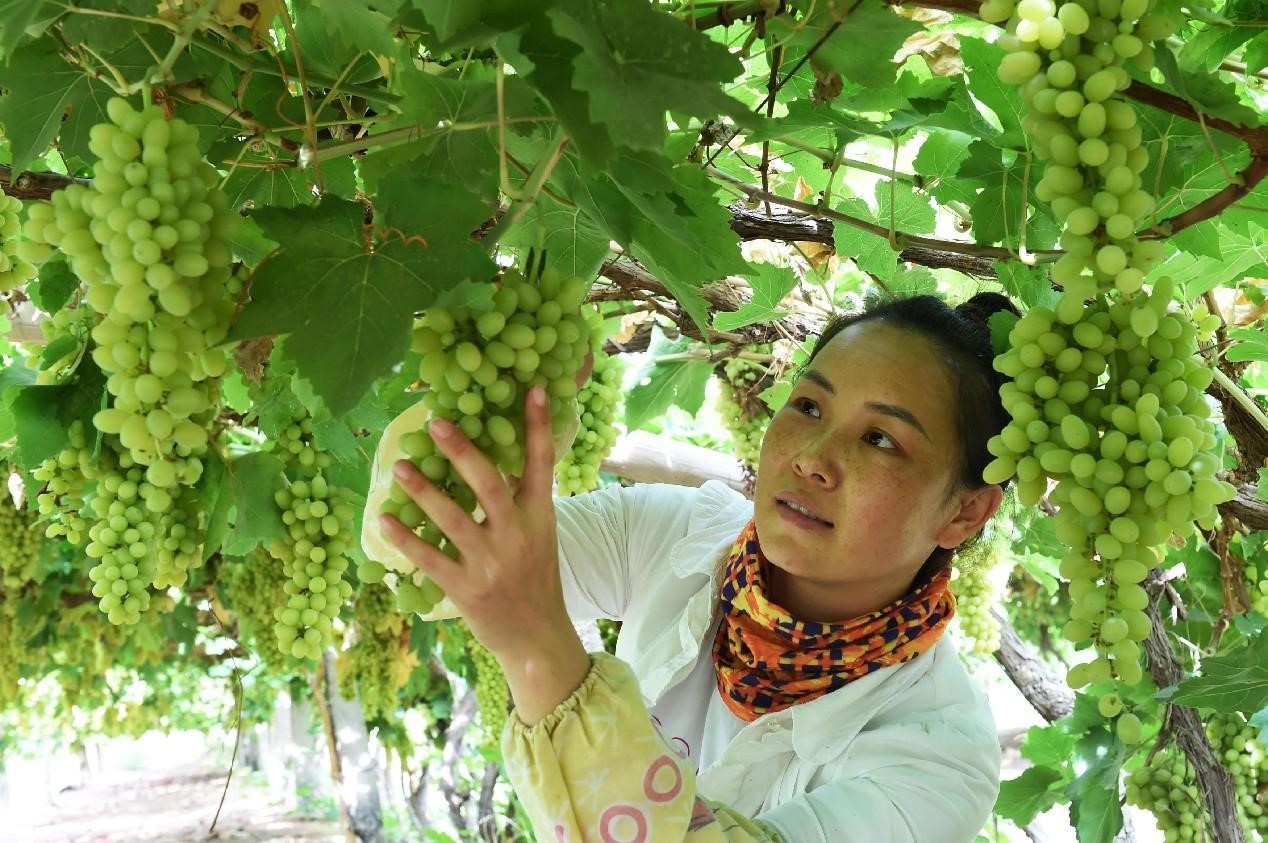 A woman picks grapes in Gaochang district, Turpan, northwest China's Xinjiang Uygur autonomous region. The grapes will be sold overseas. (People's Daily Online/Liu Jian)