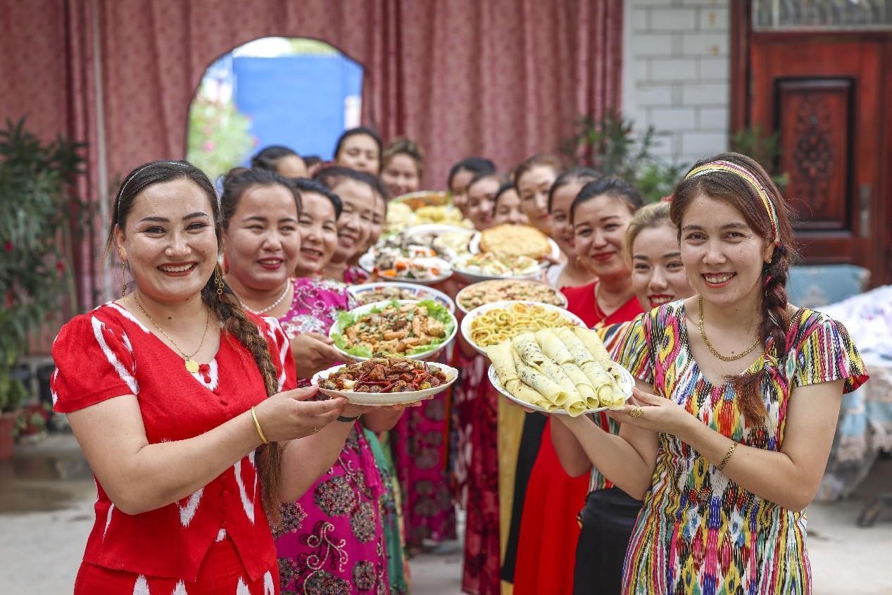 Villagers in northwest China's Xinjiang Uygur autonomous region show the food they have made, June 29, 2023. (People's Daily Online/Yuan Huanhuan)