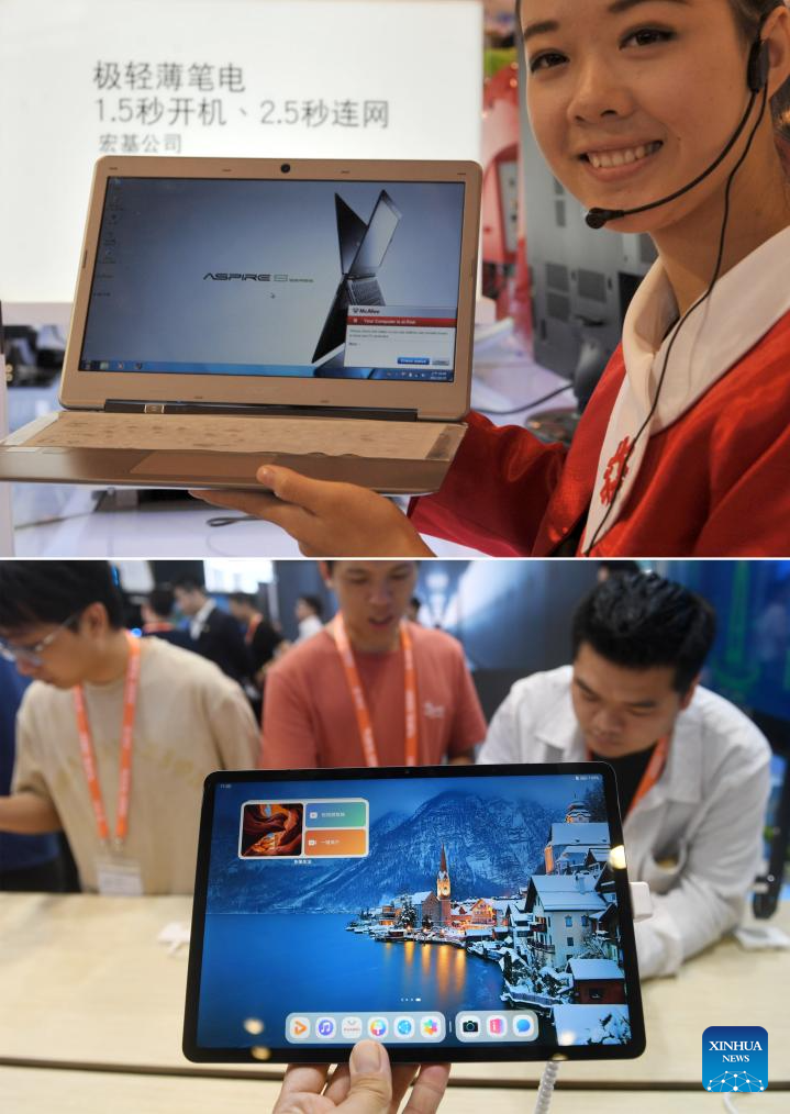 This combo photo shows an exhibitor displaying a laptop at the 8th China-ASEAN Expo (above, photo taken by Xinhua photographer Zhou Hua on Oct. 25, 2011) and visitors looking at a tablet at the 20th China-ASEAN Expo (below, photo taken by Xinhua photographer Lu Boan on Sept. 18, 2023) in Nanning, south China's Guangxi Zhuang Autonomous Region. The 20th China-ASEAN Expo is held in Nanning from September 16-19, with nearly 2,000 enterprises attending.