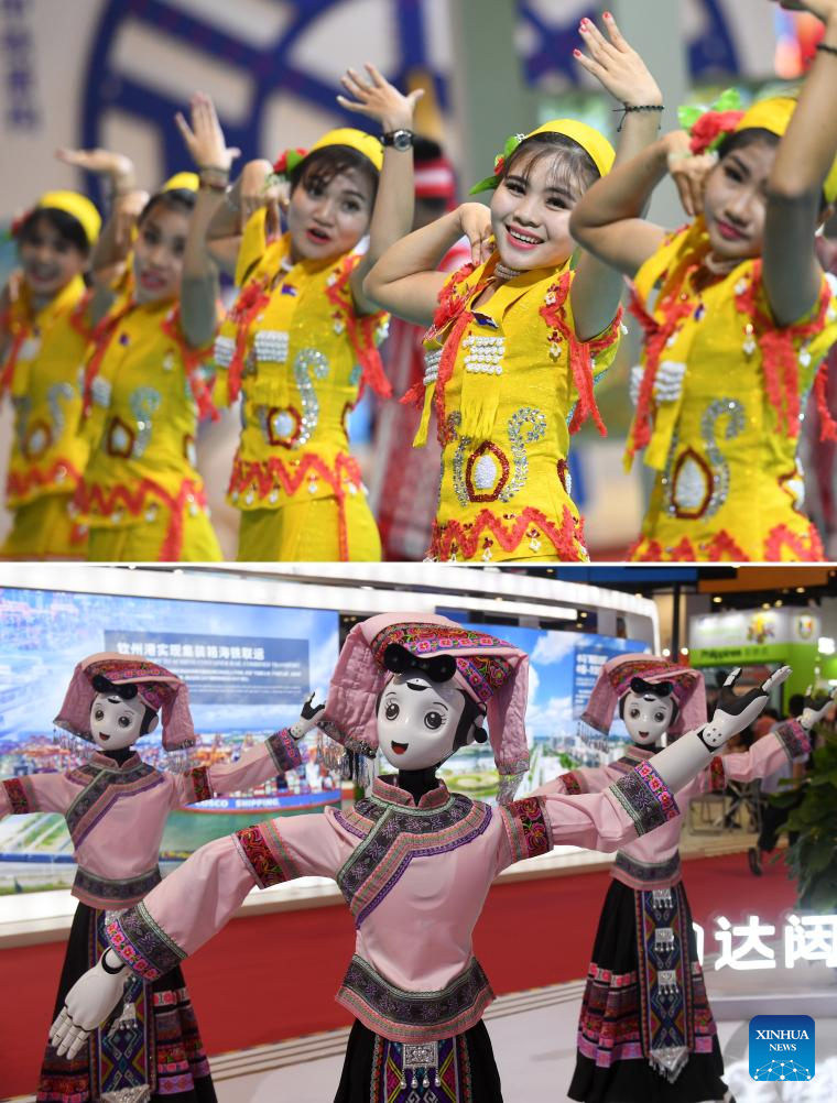 This combo photo shows performers dancing at the 15th China-ASEAN Expo on Sept. 12, 2018 (above) and robots dancing at the 20th China-ASEAN Expo (below, photo taken by Xinhua photographer Lu Boan on Sept. 18, 2023) in Nanning, south China's Guangxi Zhuang Autonomous Region. The 20th China-ASEAN Expo is held in Nanning from September 16-19, with nearly 2,000 enterprises attending.