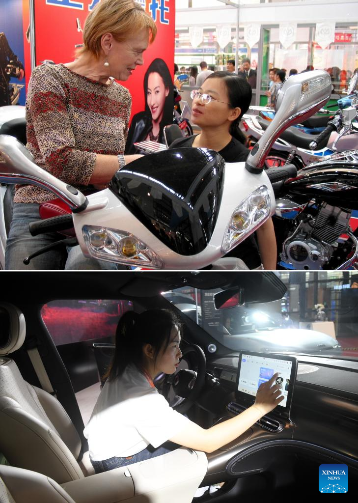 This combo photo shows a Belgian guest learning about information at a motorcycle booth at the 1st China-ASEAN Expo (above, photo taken by Xinhua photographer Liu Guangming on Nov. 5, 2004) and a staff member adjusting a car at the 20th China-ASEAN Expo (below, photo taken by Xinhua photographer Lu Boan on Sept. 18, 2023) in Nanning, south China's Guangxi Zhuang Autonomous Region. The 20th China-ASEAN Expo is held in Nanning from September 16-19, with nearly 2,000 enterprises attending.