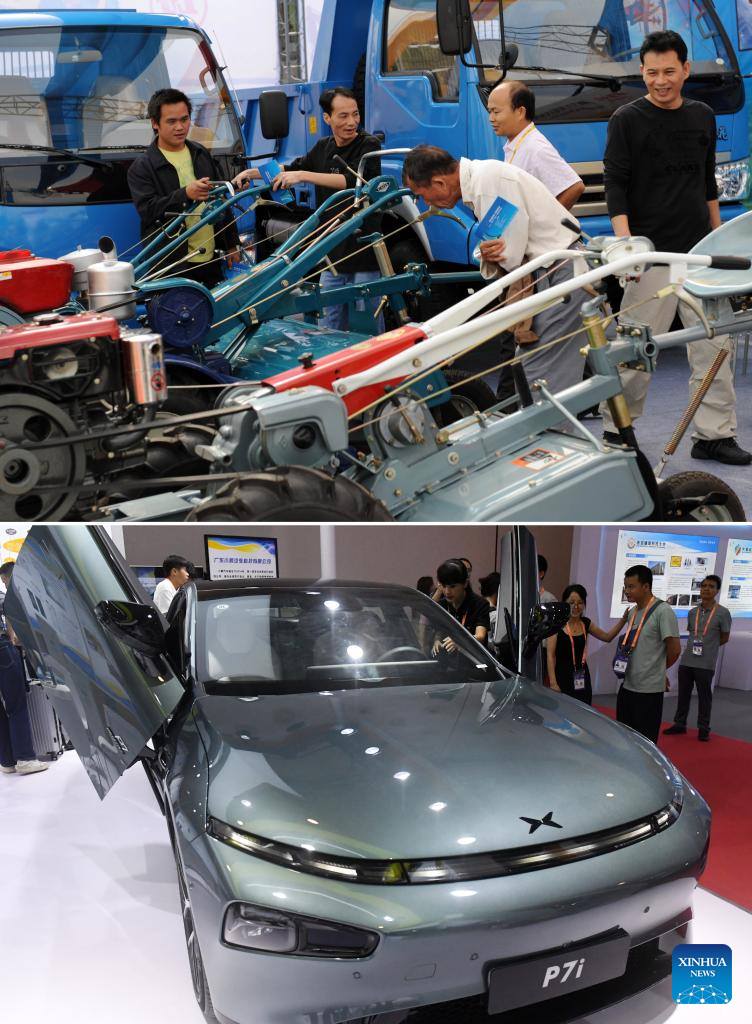 This combo photo shows people looking at a tractor at the 5th China-ASEAN Expo (L, photo taken by Xinhua photographer Liu Guangming on Oct. 25, 2008) and people looking at a car at the 20th China-ASEAN Expo (R, photo taken by Xinhua photographer Lu Boan on Sept. 18, 2023) in Nanning, south China's Guangxi Zhuang Autonomous Region. The 20th China-ASEAN Expo is held in Nanning from September 16-19, with nearly 2,000 enterprises attending.