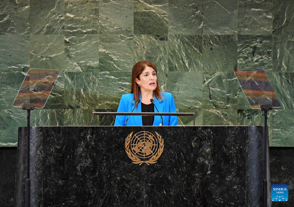 President of the UN Economic and Social Council Paula Narvaez speaks during the Sustainable Development Goals Summit at the UN headquarters in New York, on Sept. 18, 2023. World leaders on Monday reaffirmed their commitment to the Sustainable Development Goals (SDGs) at the SDG summit, which is being held on the sidelines of this year's general debate of the General Assembly. In a political declaration adopted at the summit, the leaders reaffirmed their commitment to "effectively implement the 2030 Agenda and its SDGs and uphold all principles enshrined in it." (Xinhua/Li Rui)