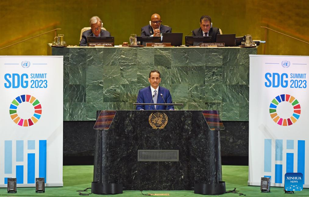 Qatari Prime Minister and Minister of Foreign Affairs Sheikh Mohammed bin Abdulrahman bin Jassim Al Thani (Front) speaks during the Sustainable Development Goals Summit at the UN headquarters in New York, on Sept. 18, 2023. World leaders on Monday reaffirmed their commitment to the Sustainable Development Goals (SDGs) at the SDG summit, which is being held on the sidelines of this year's general debate of the General Assembly. In a political declaration adopted at the summit, the leaders reaffirmed their commitment to "effectively implement the 2030 Agenda and its SDGs and uphold all principles enshrined in it." (Xinhua/Li Rui)