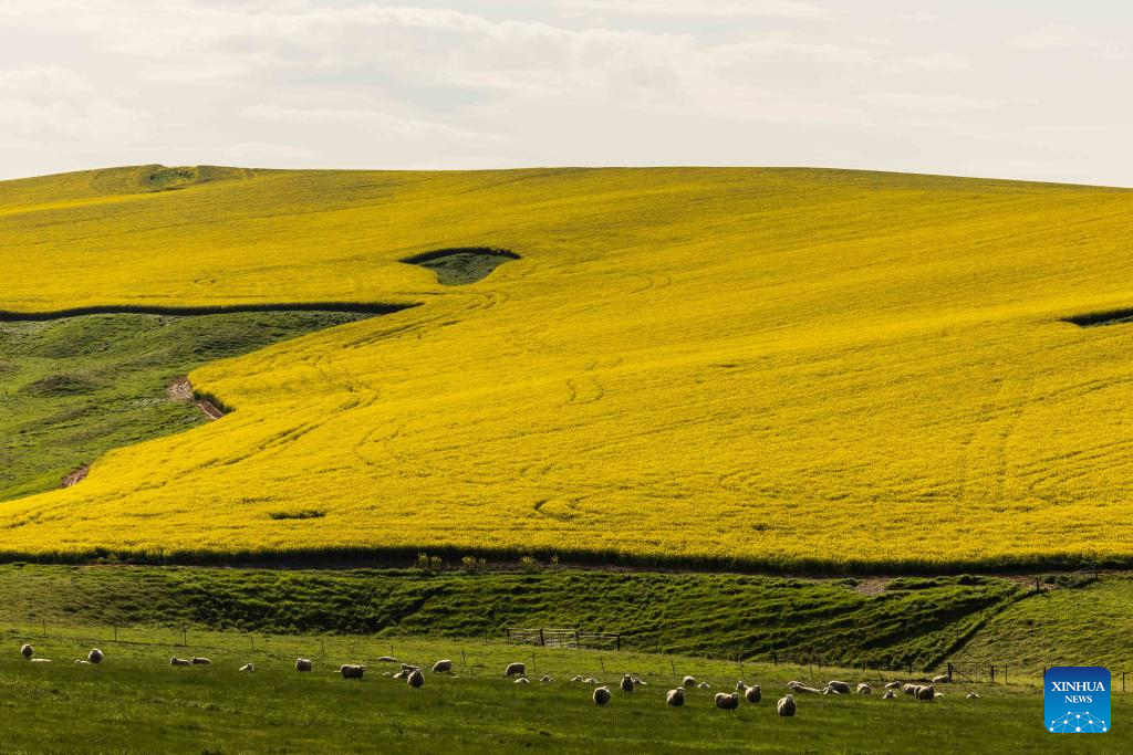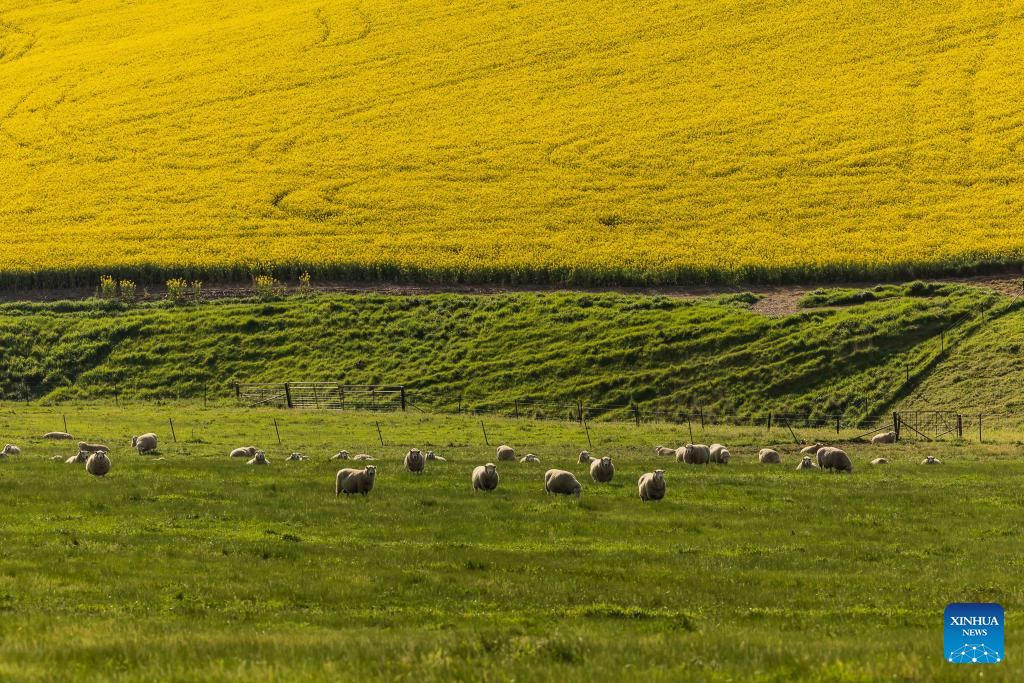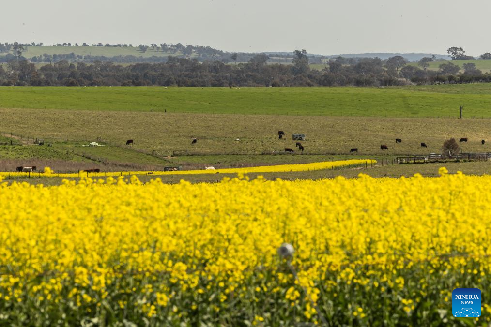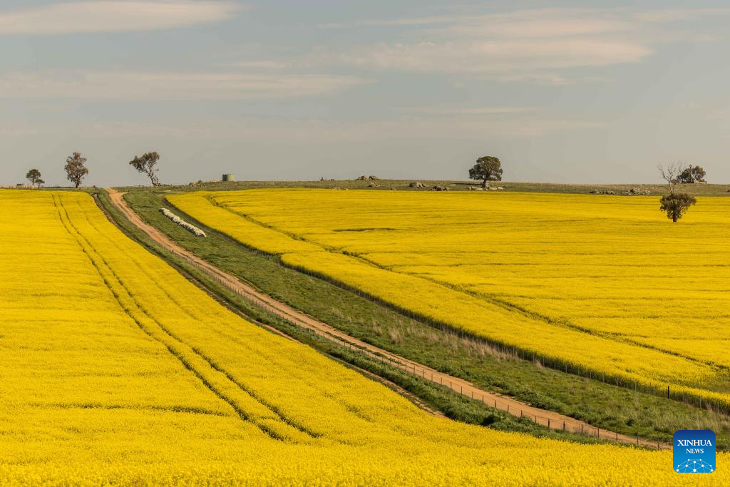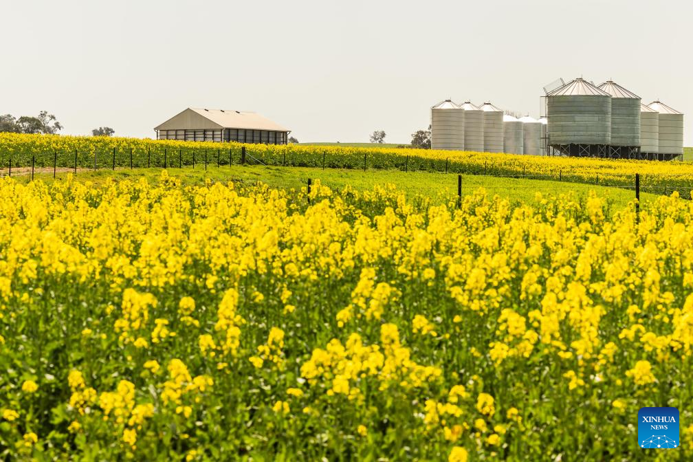 This photo taken on Sept. 18, 2023 shows blooming canola flowers on the outskirts of Canberra, Australia. (Photo by Chu Chen/Xinhua)