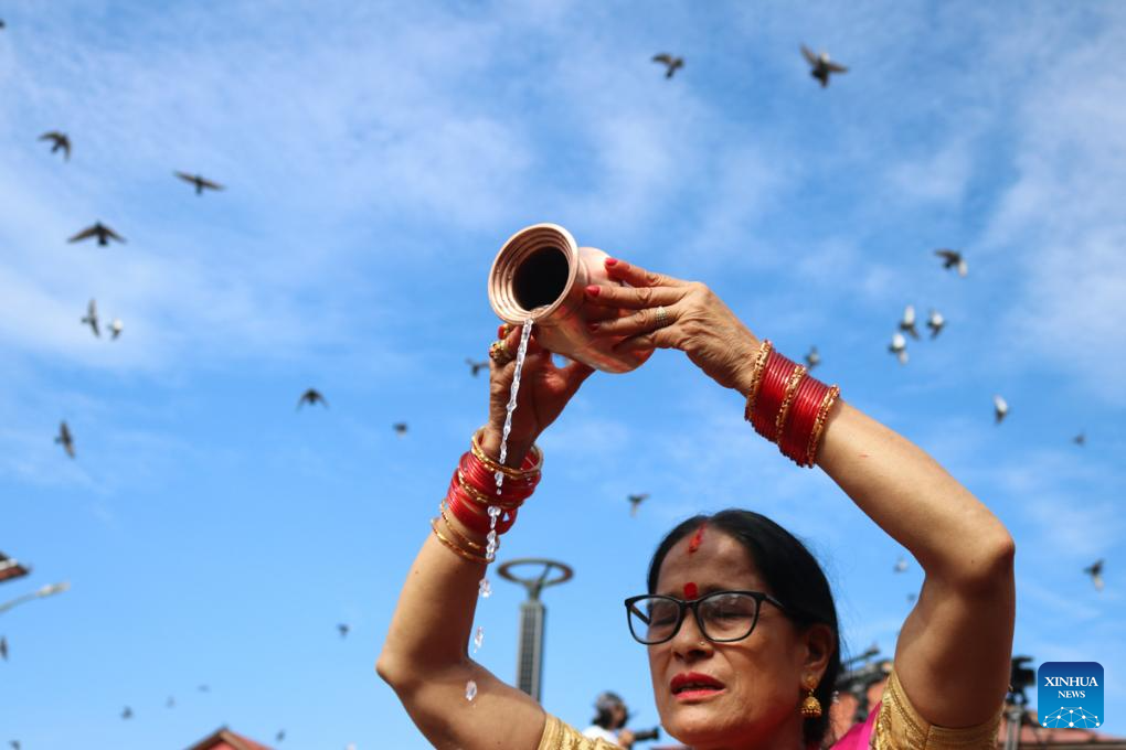 Women offer prayers during the Teej Festival in Kathmandu, Nepal, Sept. 18, 2023. (Photo by Sulav Shrestha/Xinhua)