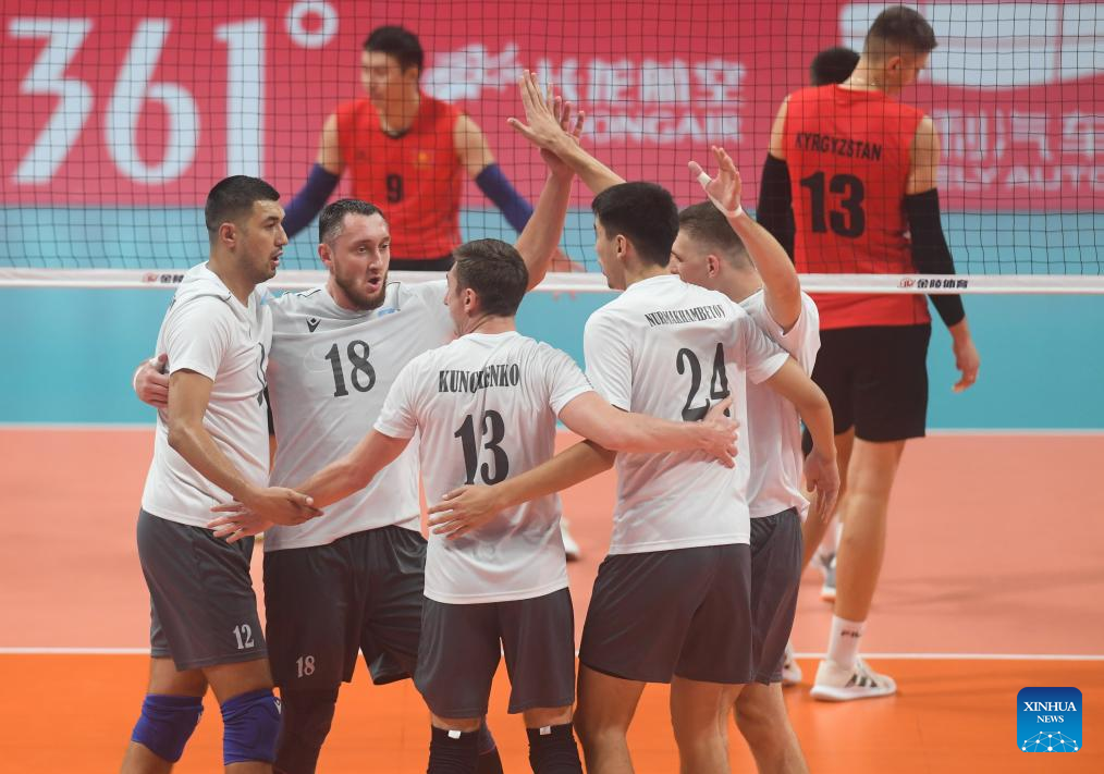 Players of Kazakhstan celebrate after scoring during the men's volleyball preliminary match between Kazakhstan and Kyrgyzstan at the 19th Asian Games in Shaoxing, east China's Zhejiang Province, Sept. 19, 2023. (Xinhua/Weng Xinyang)