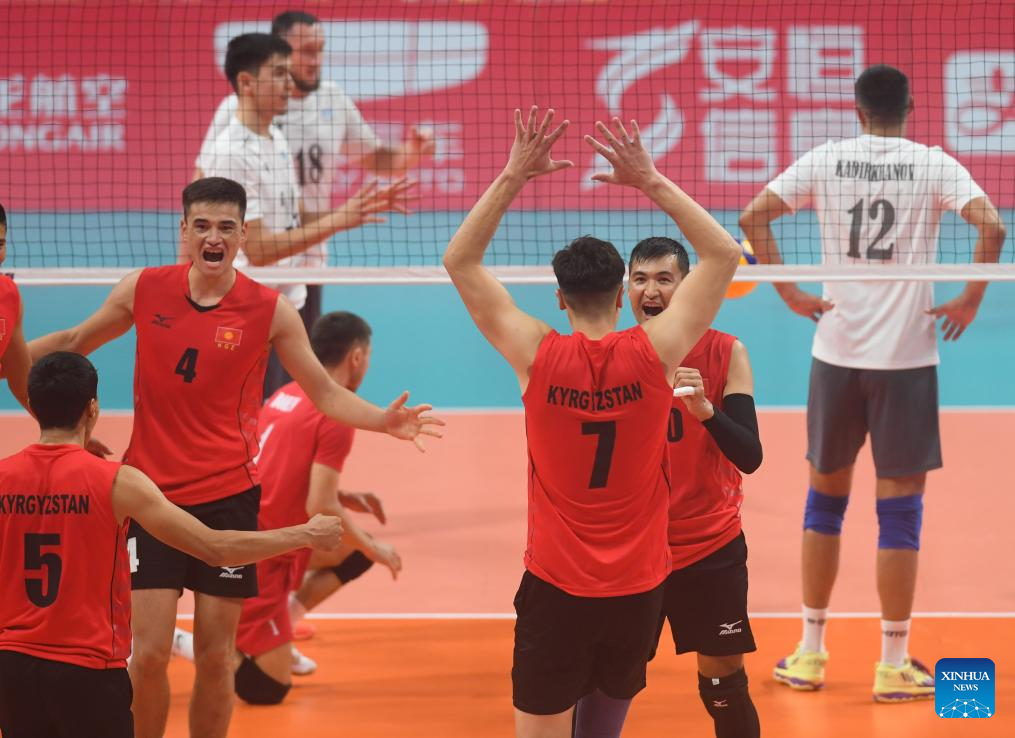Players of Kyrgyzstan celebrate after scoring during the men's volleyball preliminary match between Kazakhstan and Kyrgyzstan at the 19th Asian Games in Shaoxing, east China's Zhejiang Province, Sept. 19, 2023. (Xinhua/Weng Xinyang)