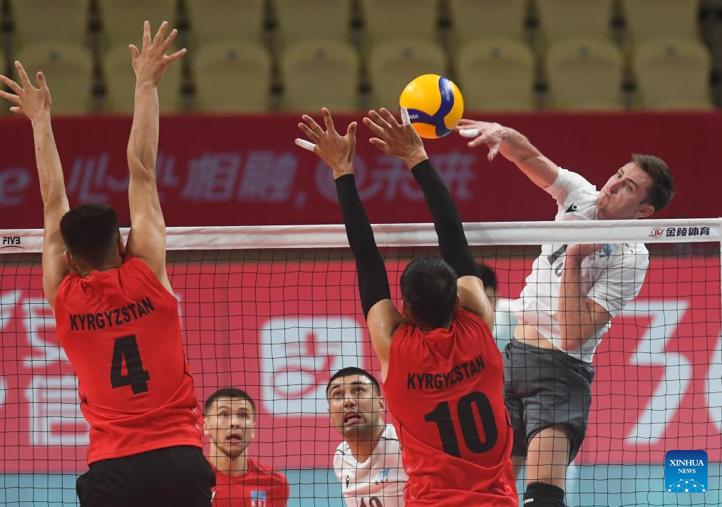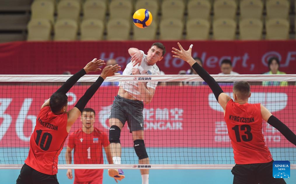 Vladislav Kunchenko (C) of Kazakhstan spikes during the men's volleyball preliminary match between Kazakhstan and Kyrgyzstan at the 19th Asian Games in Shaoxing, east China's Zhejiang Province, Sept. 19, 2023. (Xinhua/Weng Xinyang)