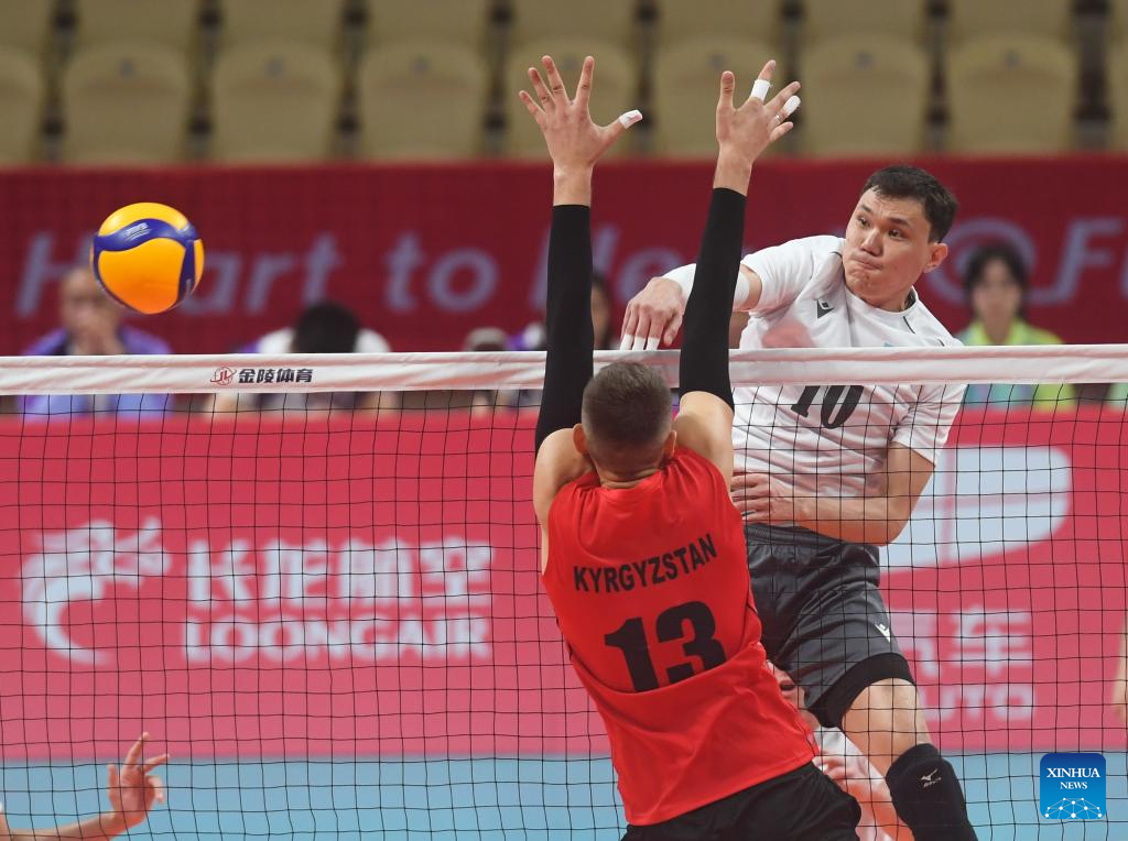 Zasyrek Trelin (R) of Kazakhstan spikes during the men's volleyball preliminary match between Kazakhstan and Kyrgyzstan at the 19th Asian Games in Shaoxing, east China's Zhejiang Province, Sept. 19, 2023. (Xinhua/Weng Xinyang)