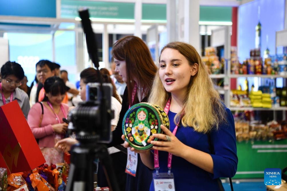 A Russian exhibitor promotes products through livestreams during the 30th China Yangling Agricultural Hi-tech Fair in Yangling, northwest China's Shaanxi Province, Sept. 19, 2023. Under the theme of "soil health and food security," the 5-day fair kicked off here on Tuesday. The event, which more than 1,500 exhibitors from a total of 39 countries and regions are attending, will feature innovations in agricultural high-tech achievements, exchange activities, and hold 11 conferences and forums as well as eight exhibitions, among others. (Xinhua/Zhang Bowen)