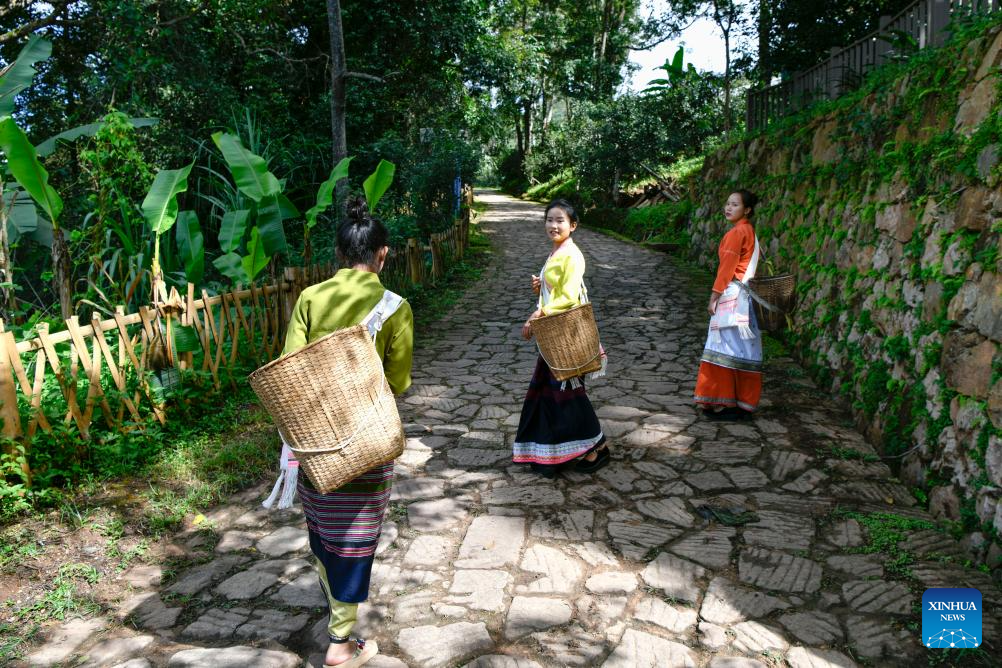 Tea farmers prepare to go to an old tea forest of the Jingmai Mountain to pick tea leaves in Pu'er, southwest China's Yunnan Province, Sept. 19, 2023. Local tea farmers here are busy picking tea leaves in harvest season to meet the market demand. (Xinhua/Tang Rufeng)