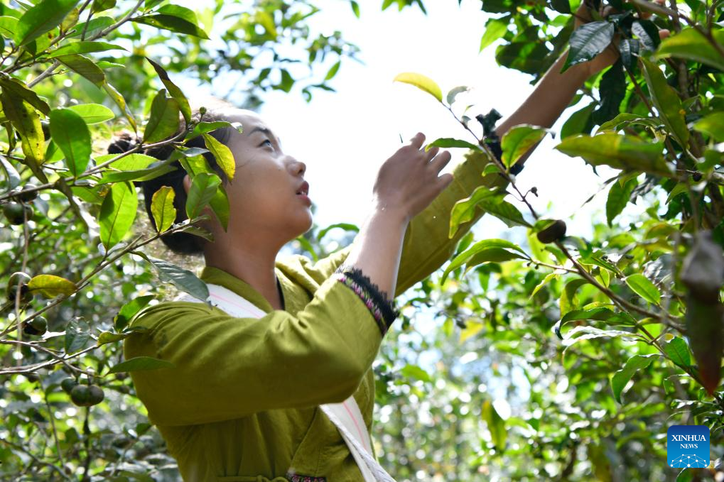 A tea farmer picks tea leaves in an old tea forest of the Jingmai Mountain in Pu'er, southwest China's Yunnan Province, Sept. 19, 2023. Local tea farmers here are busy picking tea leaves in harvest season to meet the market demand. (Xinhua/Hu Chao)