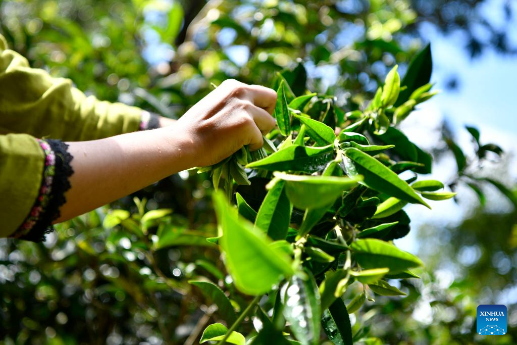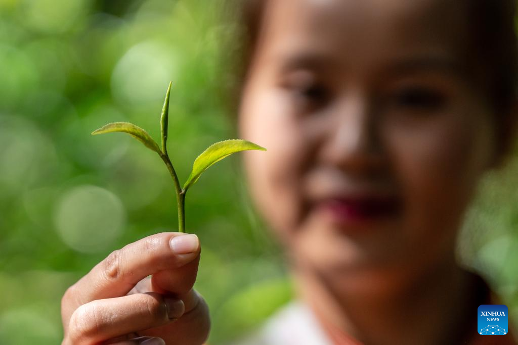 A tea farmer displays picked tea leaves in an old tea forest of the Jingmai Mountain in Pu'er, southwest China's Yunnan Province, Sept. 19, 2023. Local tea farmers here are busy picking tea leaves in harvest season to meet the market demand. (Xinhua/Hu Chao)