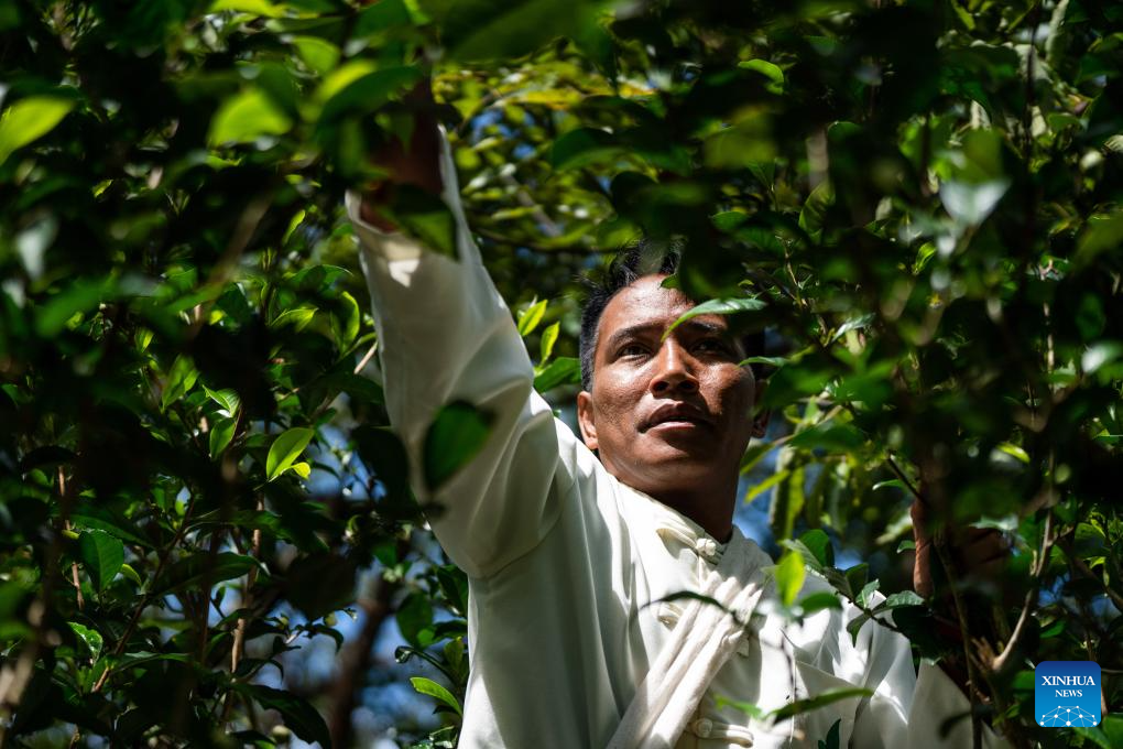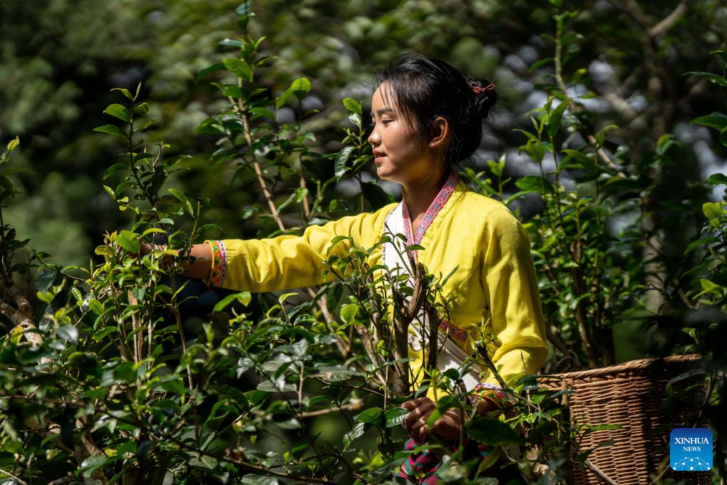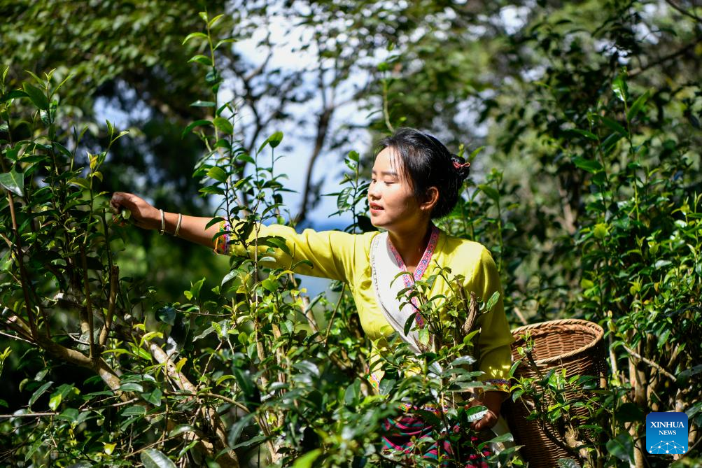 A tea farmer picks tea leaves in an old tea forest of the Jingmai Mountain in Pu'er, southwest China's Yunnan Province, Sept. 19, 2023. Local tea farmers here are busy picking tea leaves in harvest season to meet the market demand. (Xinhua/Tang Rufeng)