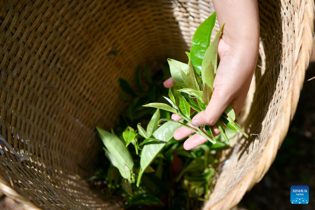 A tea farmer puts tea leaves into a basket in an old tea forest of the Jingmai Mountain in Pu'er, southwest China's Yunnan Province, Sept. 19, 2023. Local tea farmers here are busy picking tea leaves in harvest season to meet the market demand. (Xinhua/Tang Rufeng)