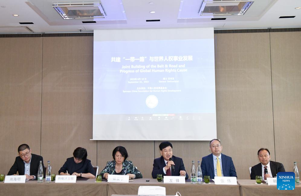 Human rights experts and scholars attend a symposium with the theme of "Joint Building of the Belt & Road and Progress of Global Human Rights Cause" in Geneva, Switzerland, on Sept. 19, 2023. A symposium focusing on the progress of the human rights cause in countries participating in the Belt and Road Initiative (BRI) cooperation was held here Tuesday. (Xinhua/Lian Yi)