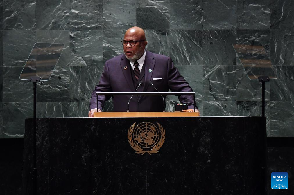 Dennis Francis (at the podium), president of the 78th session of the UN General Assembly, speaks at the opening of the General Debate of the 78th session of the UN General Assembly at the UN headquarters in New York, on Sept. 19, 2023. The General Debate of the 78th session of the United Nations General Assembly opened at the UN headquarters in New York on Tuesday, focusing on restoring global trust and solidarity in current challenging time. (Xinhua/Li Rui)