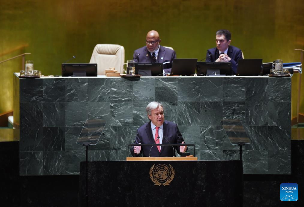 UN Secretary-General Antonio Guterres (Front) speaks at the opening of the General Debate of the 78th session of the UN General Assembly at the UN headquarters in New York, on Sept. 19, 2023. The General Debate of the 78th session of the United Nations General Assembly opened at the UN headquarters in New York on Tuesday, focusing on restoring global trust and solidarity in current challenging time. (Xinhua/Li Rui)