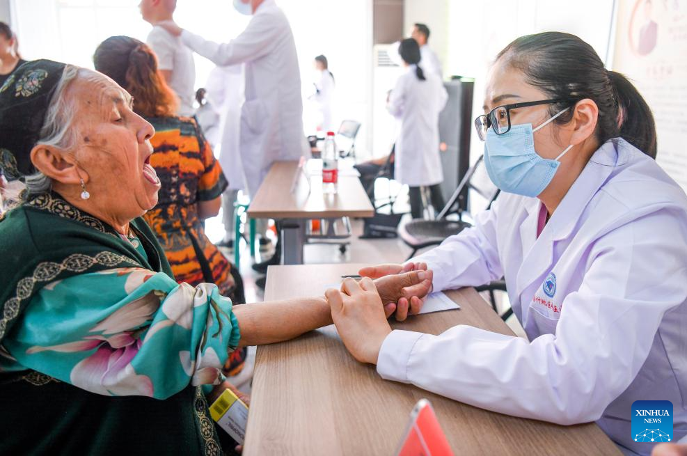 A medical worker from east China's Shandong Province gives free consultation in Kashgar, northwest China's Xinjiang Uygur Autonomous Region, Sept. 16, 2023. Medical workers from east China's Shandong Province have provided medical service for the local people in Kashgar. (Xinhua/Wang Fei)