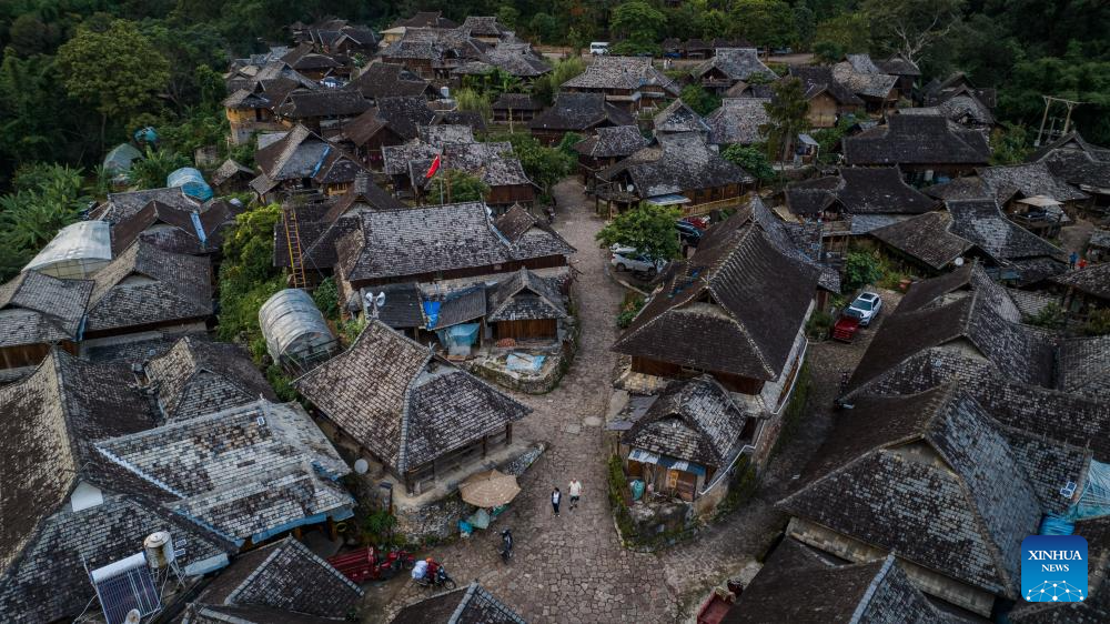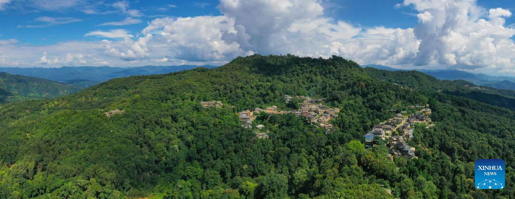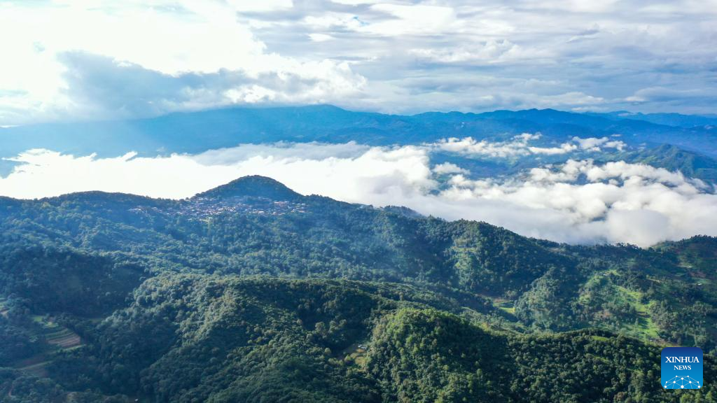 This aerial photo taken on Sept. 14, 2023 shows the Nuogang Village in Pu'er City, southwest China's Yunnan Province. The Cultural Landscape of Old Tea Forests of Jingmai Mountain in Pu'er was inscribed on the UNESCO World Heritage List on Sunday at the extended 45th session of the UNESCO World Heritage Committee in Riyadh, Saudi Arabia, making it China's 57th World Heritage Site. (Xinhua/Hu Chao)