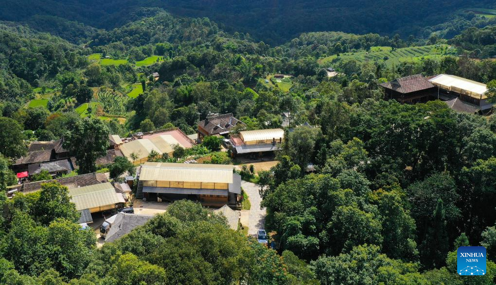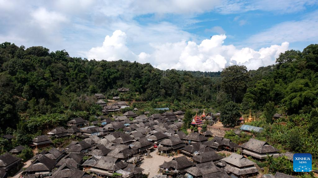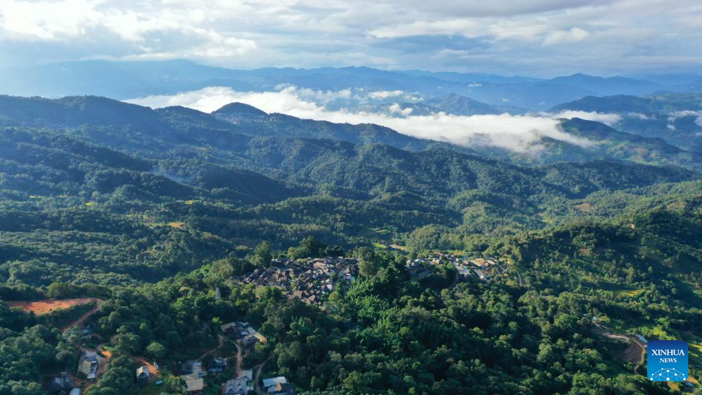 This aerial photo taken on Sept. 18, 2023 shows the Wengji Village in Pu'er City, southwest China's Yunnan Province. The Cultural Landscape of Old Tea Forests of Jingmai Mountain in Pu'er was inscribed on the UNESCO World Heritage List on Sunday at the extended 45th session of the UNESCO World Heritage Committee in Riyadh, Saudi Arabia, making it China's 57th World Heritage Site. (Xinhua/Hu Chao)