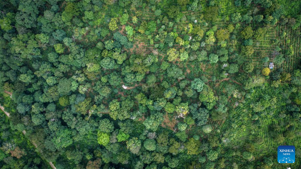 This aerial photo taken on Aug. 29, 2023 shows an old tea forest in Pu'er City, southwest China's Yunnan Province. The Cultural Landscape of Old Tea Forests of Jingmai Mountain in Pu'er was inscribed on the UNESCO World Heritage List on Sunday at the extended 45th session of the UNESCO World Heritage Committee in Riyadh, Saudi Arabia, making it China's 57th World Heritage Site. (Xinhua/Li He)