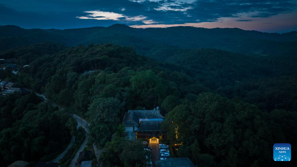 This aerial photo taken on Sept. 18, 2023 shows the Wengji Village at sunset in Pu'er City, southwest China's Yunnan Province. The Cultural Landscape of Old Tea Forests of Jingmai Mountain in Pu'er was inscribed on the UNESCO World Heritage List on Sunday at the extended 45th session of the UNESCO World Heritage Committee in Riyadh, Saudi Arabia, making it China's 57th World Heritage Site. (Xinhua/Hu Chao)