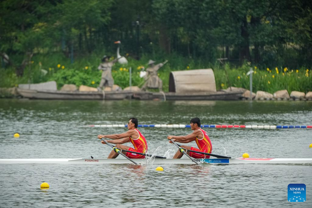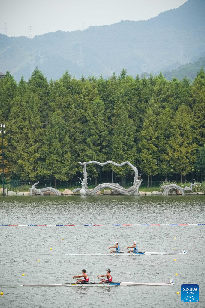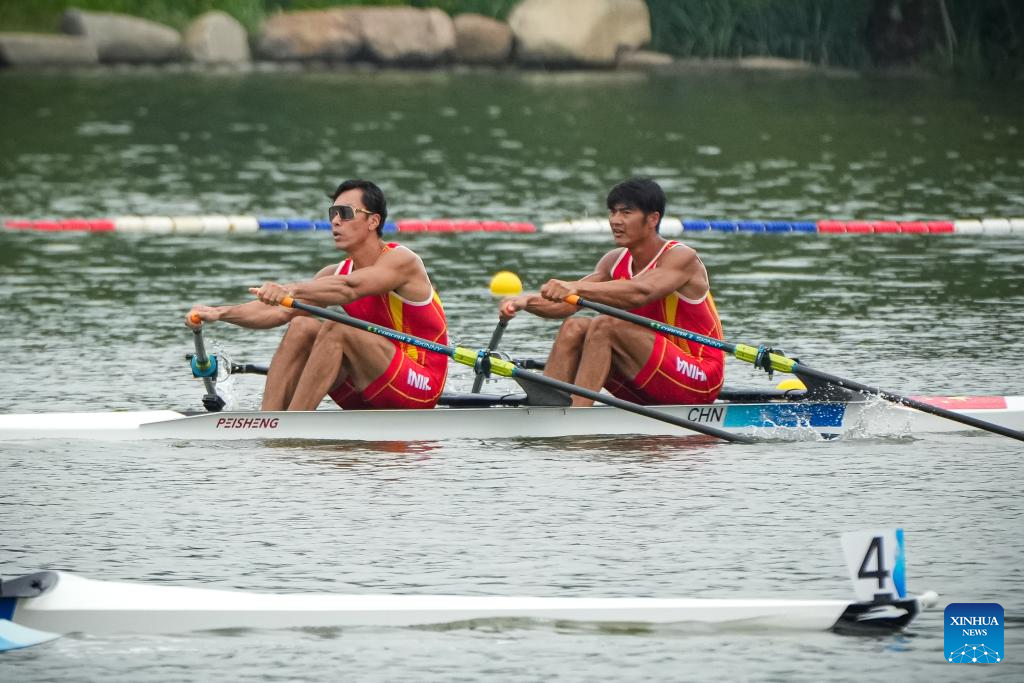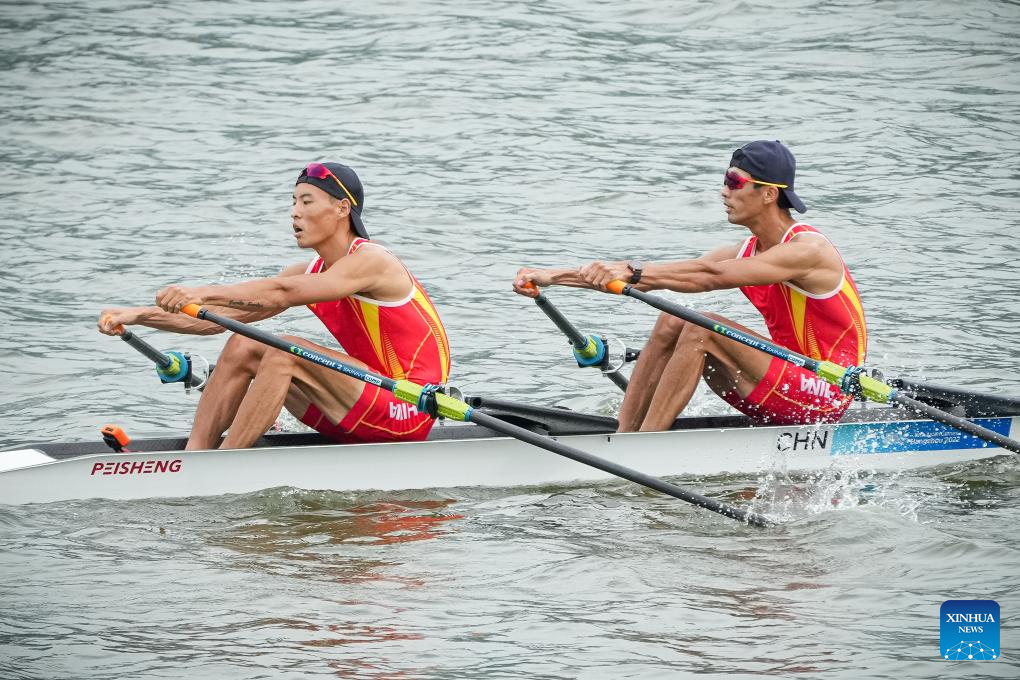 China's Fan Junjie (R) and Sun Man compete during the Men's Light-Weight Double Sculls Heat of rowing at the 19th Asian Games in Hangzhou, east China's Zhejiang Province, Sept. 20, 2023. (Xinhua/Jiang Han)