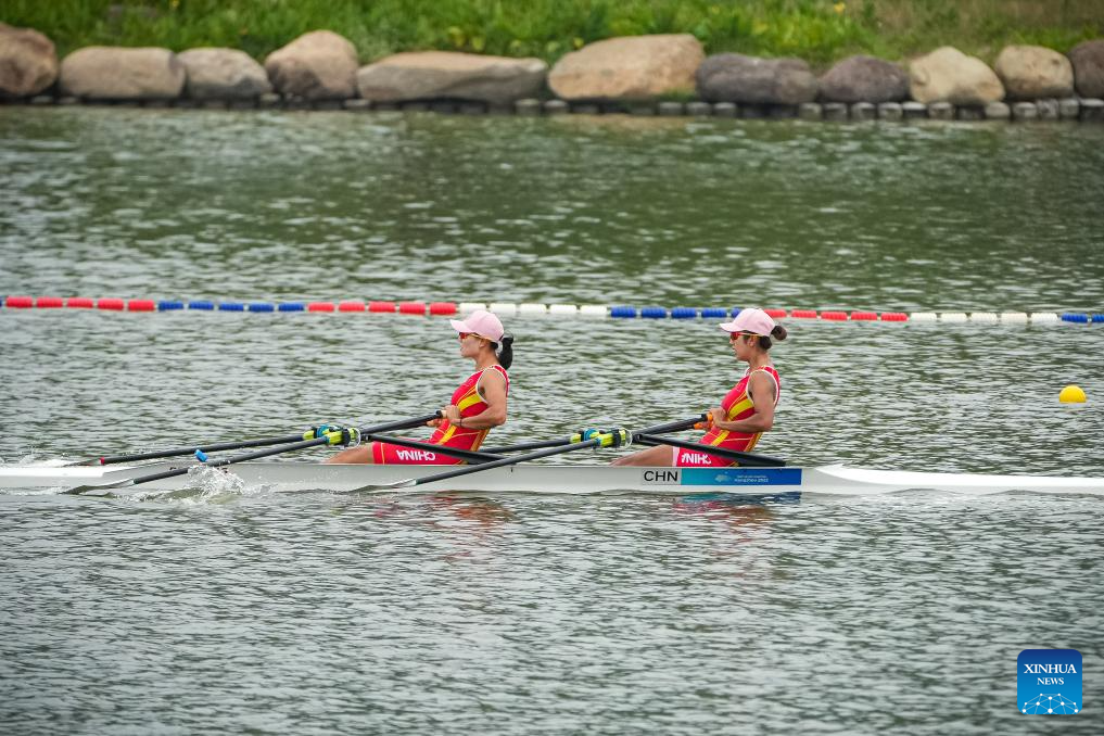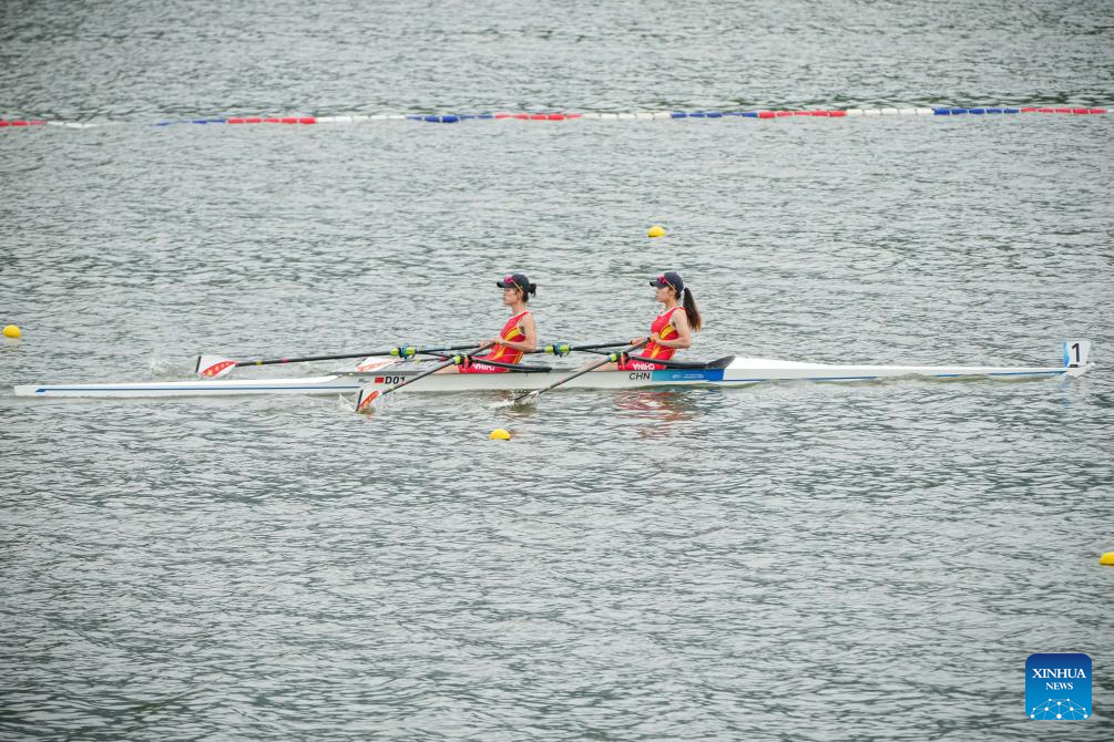 China's Lu Shiyu (R) and Shen Shuangmei compete during the Women's Double Sculls Heat of rowing at the 19th Asian Games in Hangzhou, east China's Zhejiang Province, Sept. 20, 2023. (Xinhua/Jiang Han)
