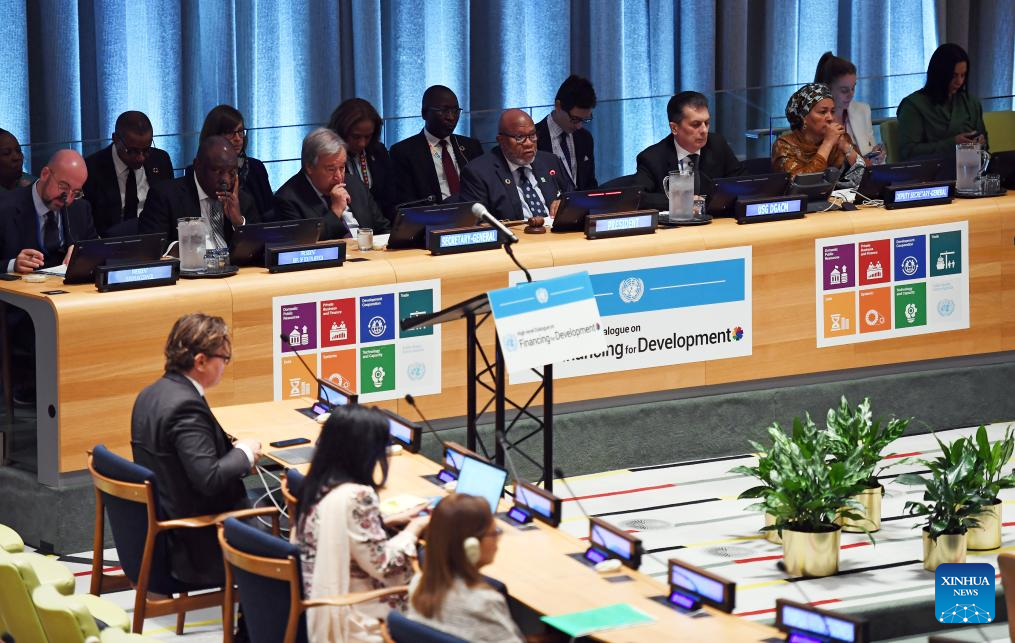 The UN High-level Dialogue on Financing for Development is held during the 78th session of the UN General Assembly at the UN headquarters in New York, on Sept. 20, 2023. The UN chief on Wednesday urged global policymakers to unlock better financing and tackle the great finance divide, as progress on some of the Sustainable Development Goals has gone into reverse for the first time in decades. (Xinhua/Li Rui)