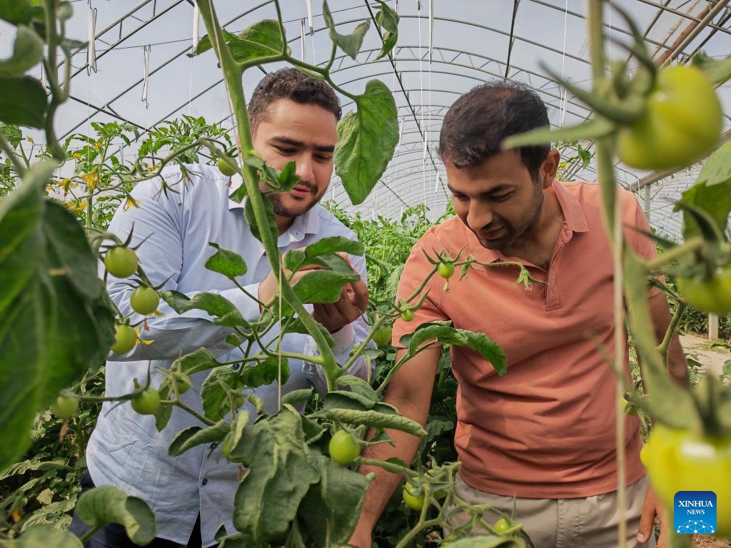Mustafa Furkan Ozgener (R), a staff member from Trkiye, shows Egyptian businessman Youssef Elkorma around in a tomato greenhouse at an agricultural base in Pingluo County, Shizuishan City, northwest China's Ningxia Hui Autonomous Region, Sept. 14, 2023. (Xinhua/Xie Jianwen)