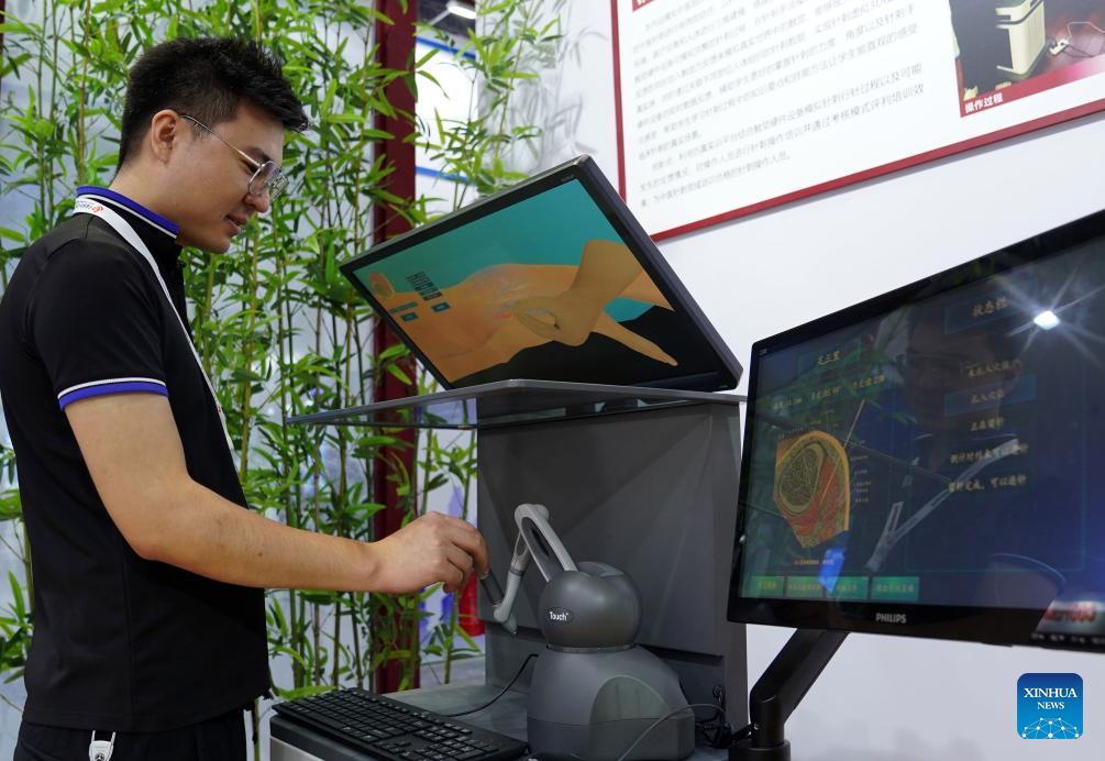 A staff member demonstrates a simulation training system for acupuncture manipulation at the stand of Shanghai University of Traditional Chinese Medicine at the 23rd China International Industry Fair in Shanghai, east China, Sept. 19, 2023. More than 800 projects from over 80 universities are displayed at the exhibition area of universities at the ongoing 23rd China International Industry Fair. (Xinhua/Liu Ying)