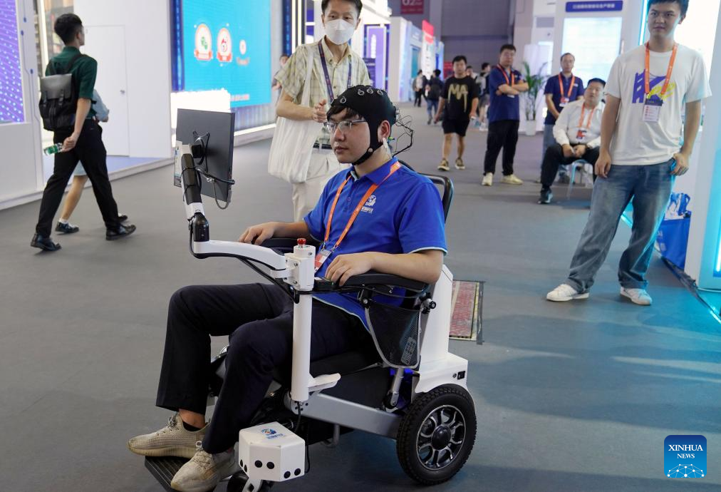 A staff member from the stand of Shanghai University demonstrates a brain-controlled rehabilitation wheelchair at the 23rd China International Industry Fair in Shanghai, east China, Sept. 20, 2023. More than 800 projects from over 80 universities are displayed at the exhibition area of universities at the ongoing 23rd China International Industry Fair. (Xinhua/Liu Ying)