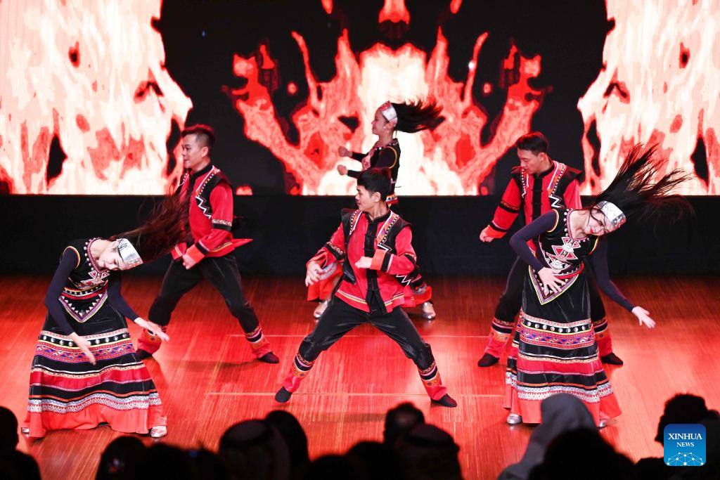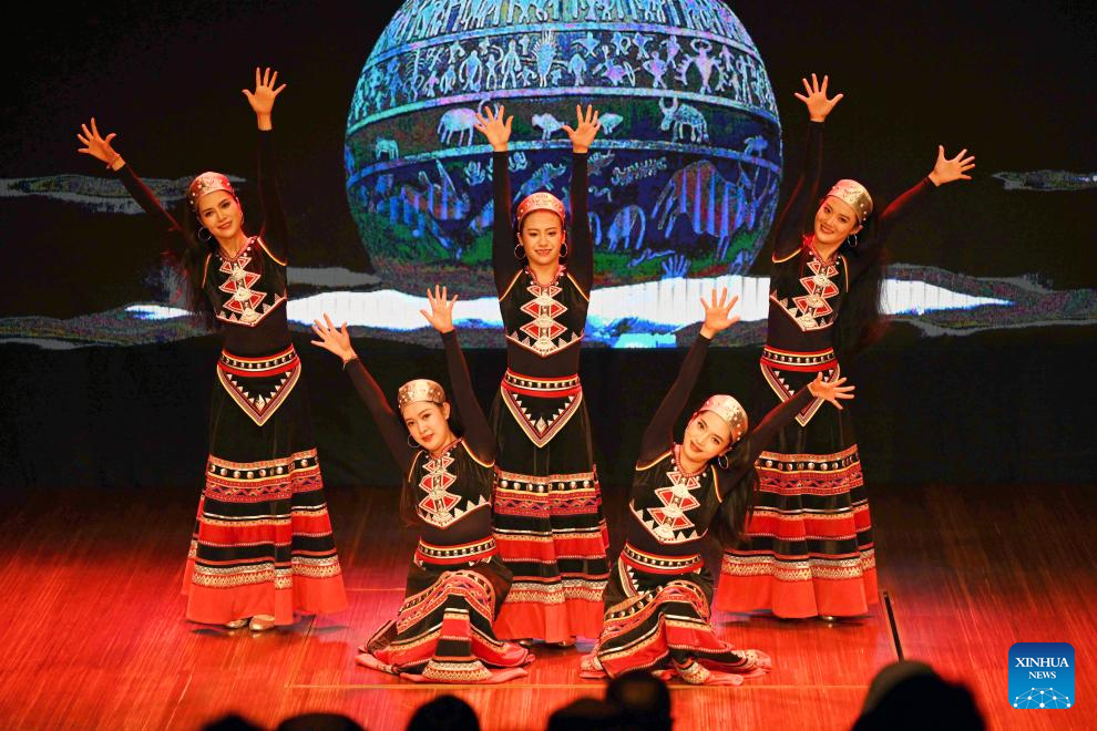 Chinese artists of an art troupe from Lincang City of southwest China's Yunnan Province perform in Capital Governorate, Kuwait, Sept. 19, 2023. The Kuwait Chinese Cultural Center held Tuesday its first show in Capital Governorate since its trial run. Chinese artists from Yunnan Province performed during the show, presenting the rich culture of ethnic minorities of Yunnan to the audience. (Photo by Asad/Xinhua)