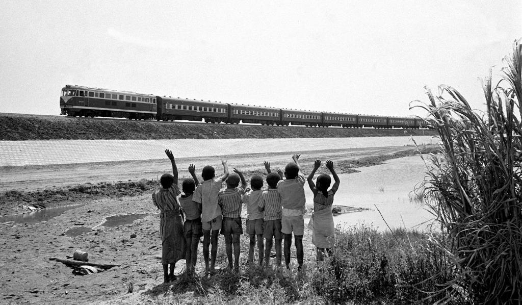 Tanzanian children cheering the arrival of a train along the Tazara railway, 1967. File photo by Xinhua.