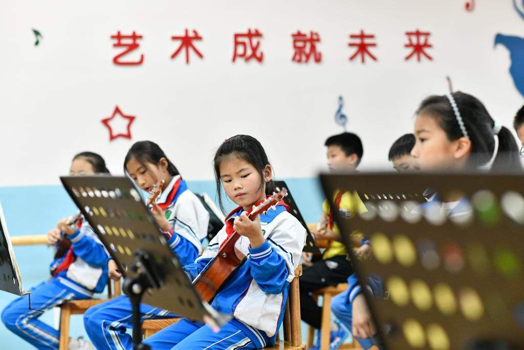 Students learn to play ukulele at a primary school in Zheng'an County, southwest China's Guizhou Province, May 13, 2022. (Xinhua/Yang Wenbin)
