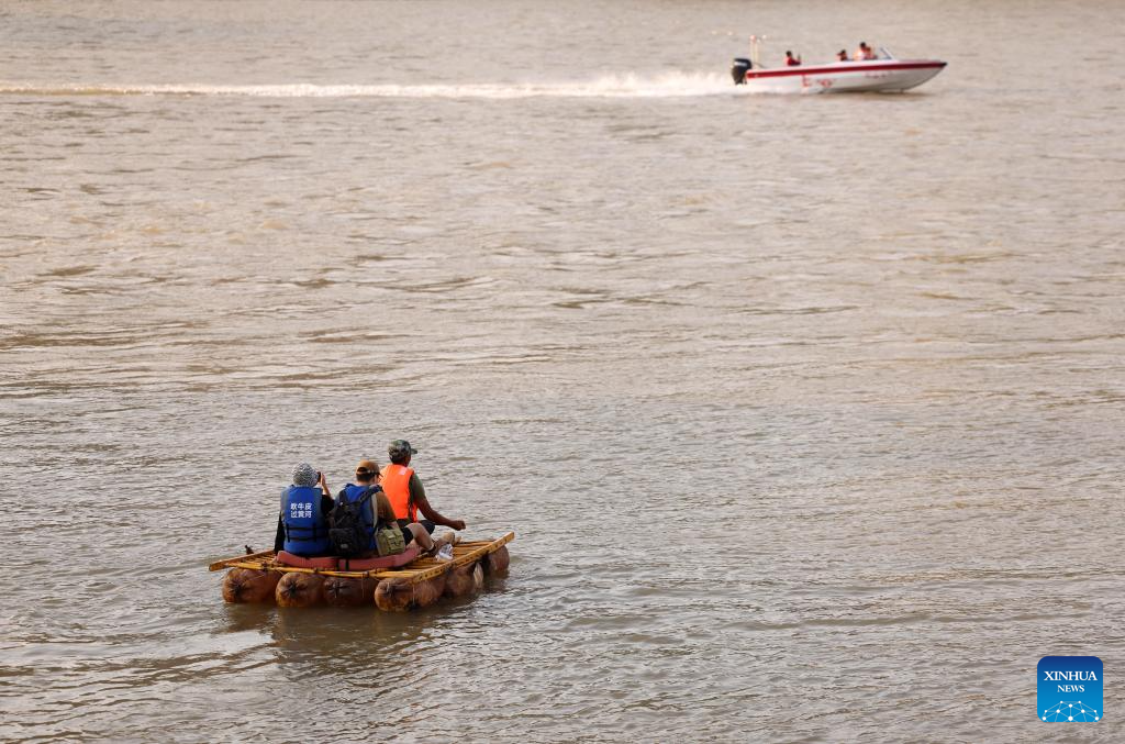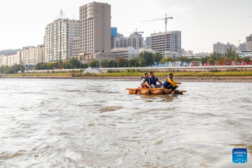 Tourists take a sheepskin raft on the Yellow River in Lanzhou, northwest China's Gansu Province, Sept. 5, 2023. Niu Qiang, a sheepskin raft worker from Huining of northwest China's Gansu Province, has been doing the job for 27 years since 16 years old on the Lanzhou section of the Yellow River. (Xinhua/Xing Guangli)
