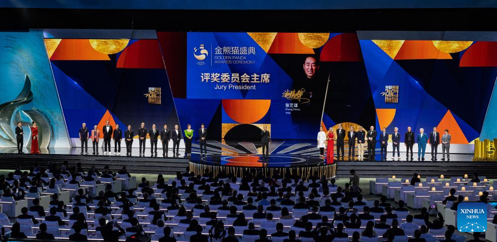 Members of the jury of the inaugural Golden Panda Awards are seen on stage in Chengdu, southwest China's Sichuan Province, Sept. 20, 2023. (Xinhua/Jiang Hongjing)