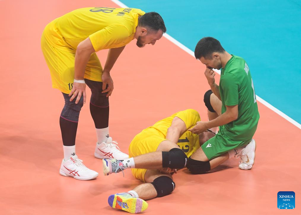 Vladislav Kunchenko (C) of Kazakhstan falls on the ground during the Volleyball Men's Preliminary Round Pool A match between China and Kazakhstan at the 19th Asian Games in Shaoxing, east China's Zhejiang Province, Sept. 21, 2023. (Xinhua/Weng Xinyang)