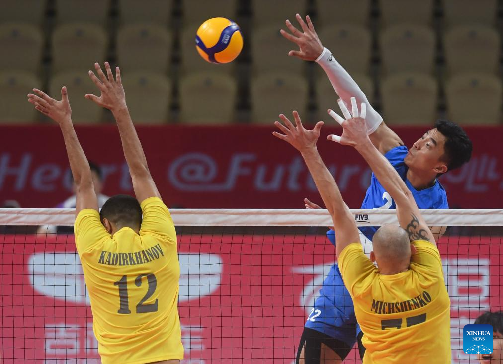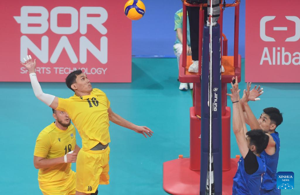 Zhaxylyk Tleulin (2nd L) of Kazakhstan spikes the ball during the Volleyball Men's Preliminary Round Pool A match between China and Kazakhstan at the 19th Asian Games in Shaoxing, east China's Zhejiang Province, Sept. 21, 2023. (Xinhua/Weng Xinyang)