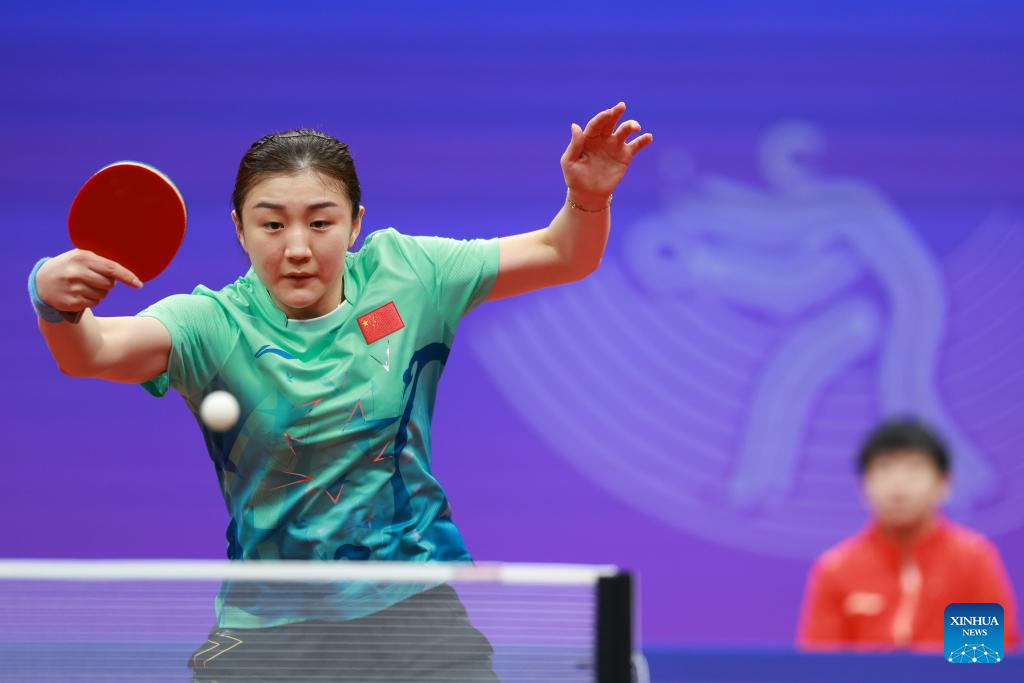 Chen Meng (top) of China hits a return to Seak Hui Li of China's Macao during the women's team preliminary group A match between China and China's Macao at the 19th Asian Games in Hangzhou, east China's Zhejiang Province, Sept. 22, 2023. (Xinhua/Sun Fei)