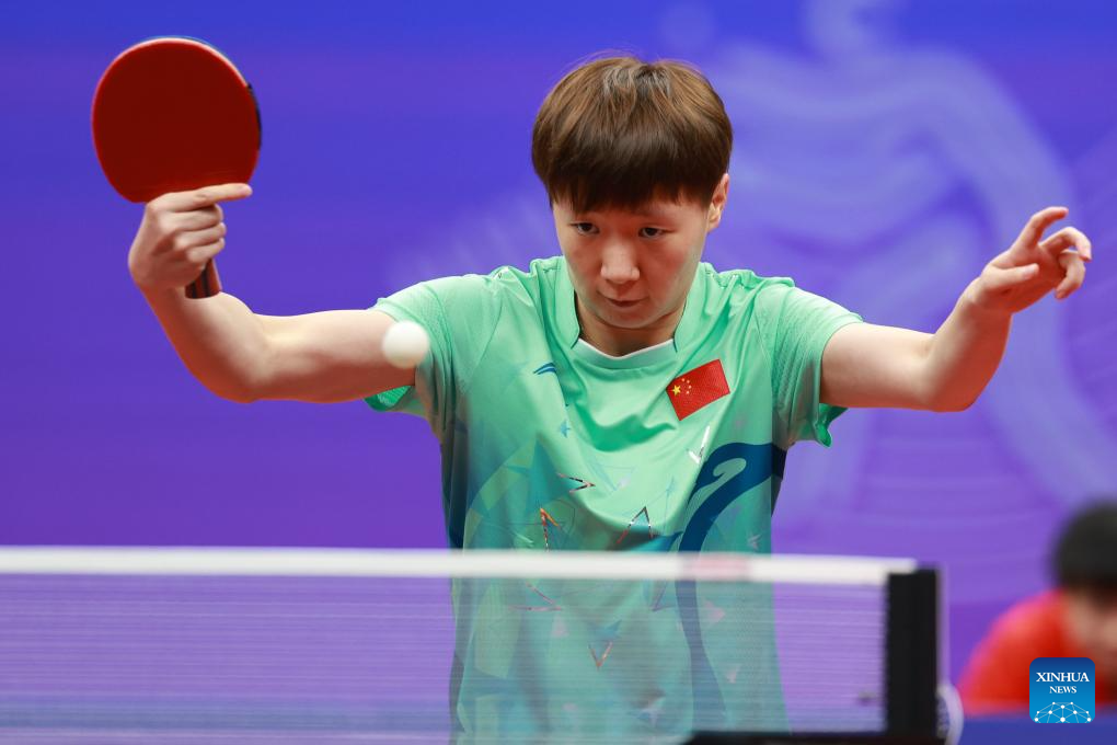 Chen Xingtong of China competes against Kuan Cheok Lam of China's Macao during the women's team preliminary group A match between China and China's Macao at the 19th Asian Games in Hangzhou, east China's Zhejiang Province, Sept. 22, 2023. (Xinhua/Liu Xu)