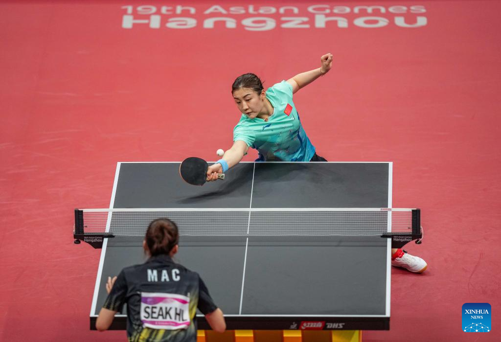 Chen Meng of China competes against Seak Hui Li of China's Macao during the women's team preliminary group A match between China and China's Macao at the 19th Asian Games in Hangzhou, east China's Zhejiang Province, Sept. 22, 2023. (Xinhua/Liu Xu)